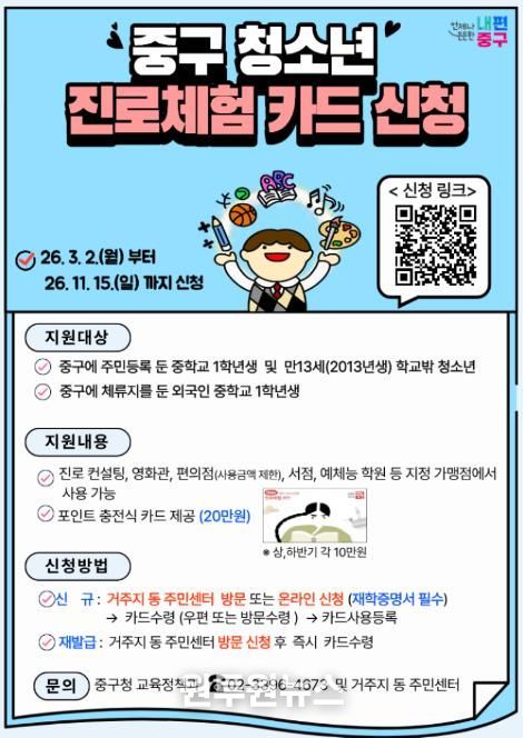 (원투원뉴스) 서울 중구가 지역 청소년들의 다양한 진로 탐색과 문화·예술 체험 기회를 확대하기 위해 ‘청소년 진로체험카드’를 지급한다.