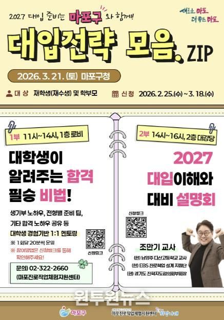 (원투원뉴스) 마포구는 3월 21일 마포구청에서 수험생과 학부모를 위한 ‘2027학년도 대입 전략 설명회 및 진학 멘토링’을 개최한다.