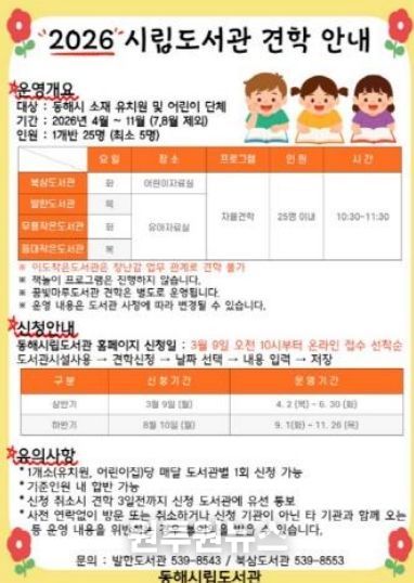 (원투원뉴스) 동해시는 관내 유치원과 어린이집을 대상으로 한 도서관 견학 프로그램을 오는 4월부터 운영한다고 밝혔다.