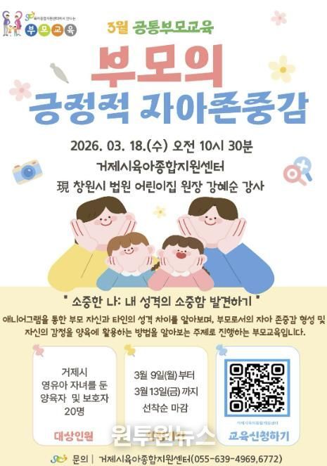 (원투원뉴스) 거제시육아종합지원센터는 부모가 스스로를 존중하고 이해하는 경험이 자녀의 정서 안정과 건강한 성장으로 이어진다는 점에 주목해, 실질적인 도움을 줄 수 있는 부모 교육 프로그램을 지속적으로 운영하고 있으며 관내 영유아 자녀를 둔 부모를 대상으로 녪년 3월 공통 부모교육’참여자를 모집한다.