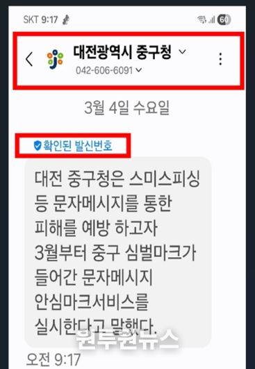 (원투원뉴스) 대전 중구는 구청에서 발송하는 구정 안내 및 민원처리 관련 문자메시지의 신뢰도를 높이고 스미싱 피해를 예방하기 위해 ‘안심마크서비스(RCS)’를 본격 시행한다고 5일 밝혔다.