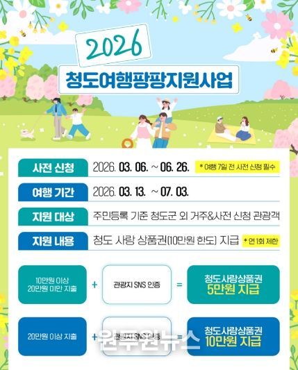 지원 대상은 청도군 외 지역에 주소를 둔 관광객이며, 신청은 오는 3월 6일(금)부터 6월 26일(금)까지 진행된다. 참여를 원하는 관광객은 여행 예정일로부터 최소 7일 전까지 청도군 홈페이지(문화관광-청도여행상품-청도여행팡팡지원-지원신청)를 통해 반드시 사전 신청을 완료해야 한다.