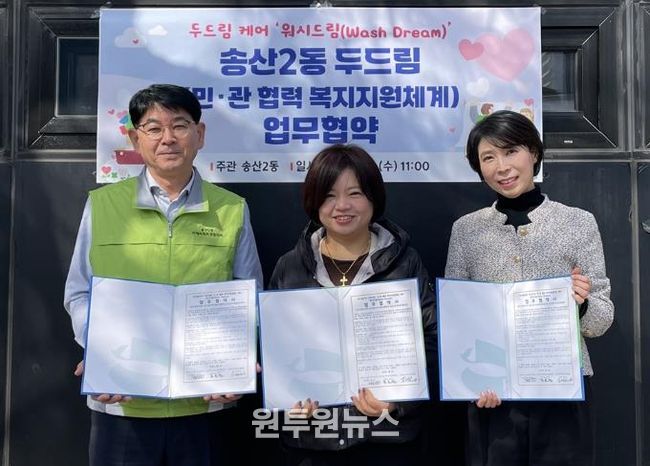 (원투원뉴스) 의정부시 송산2동주민센터는 3월 4일 QUEEN크린셀프빨래방, 송산2동 지역사회보장협의체와 취약계층 세탁지원을 위한 두드림(민관 협력 복지지원체계) 케어 ‘워시드림(Wash Dream)’ 사업 업무협약을 체결했다.