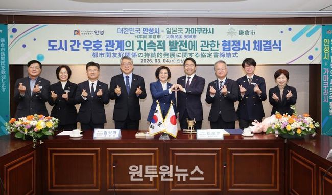 (원투원뉴스) 안성시는 2026년 3월 4일 오전 11시 안성시청 본관 2층 상황실에서 일본 가나가와현 가마쿠라시(시장 마쓰오 다카시)와 '도시 간 우호 관계의 지속적 발전에 대한 협정'을 체결하고 양 도시 간 문화·예술 및 청소년 분야 교류를 본격 추진하기로 했다.
