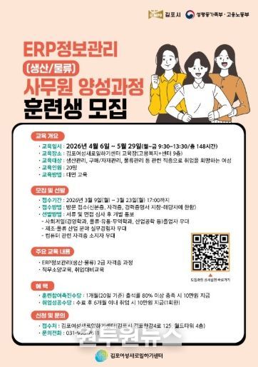 (원투원뉴스) 김포여성새로일하기센터는 지역 산업 수요에 부합하는 전문 인력 양성과 경력보유 여성의 안정적인 취업 지원을 위해 '전사적 자원관리(ERP) 생산·물류 사무원 양성 과정' 훈련생을 모집한다.