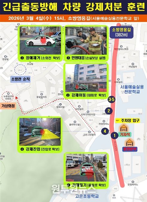 (원투원뉴스) 서울특별시 소방재난본부는 4일 서대문구 홍제동 소재 명예 도로명인 소방영웅길 일대에서 소방차 출동로 확보와 신속한 현장 대응력 강화를 위한 ‘긴급출동 방해 차량 강제처분’에 대한 공개 훈련을 진행했다고 밝혔다.