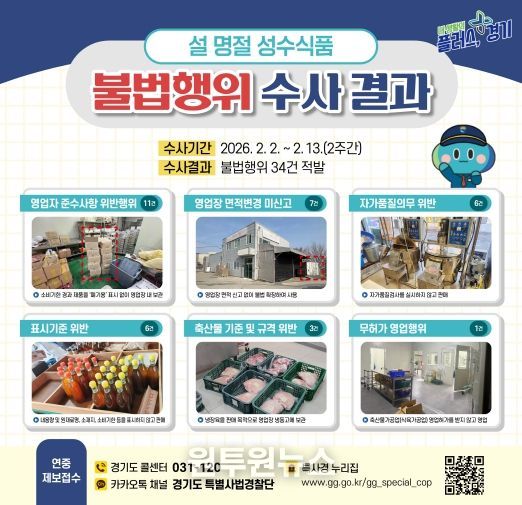 (원투원뉴스) 경기도 특별사법경찰단은 설 명절 성수식품 불법행위를 수사해 영업자 준수사항 위반과 영업장 불법 확장 등 총 34건을 적발했다고 5일 밝혔다.