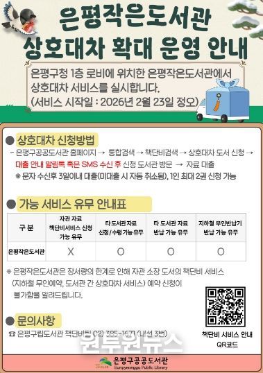 (원투원뉴스) 서울 은평구는 은평구 공공도서관 상호대차 서비스 ‘책단비’를 확대 운영한다고 밝혔다.