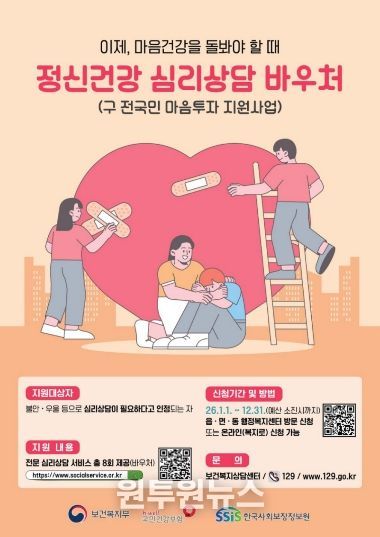 (원투원뉴스) 부산 사하구는 우울, 불안 등 정서적 어려움을 겪는 구민을 대상으로 대화 기반의 전문 심리상담 서비스를 제공하는 ‘정신건강 심리상담 바우처사업(구 전 국민 마음투자 지원사업)’을 시행한다고 밝혔다. 이 사업은 자살 예방과 정신질환의 사전 예방을 도모하고 구민의 정신건강 증진을 돕기 위해 마련된 심리지원 정책이다.