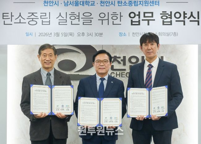 (원투원뉴스) 천안시는 5일 시청 제1소회의실에서 남서울대학교, 천안시 탄소중립지원센터와 ‘탄소중립 시민 저변 확대를 위한 업무협약’을 체결했다고 밝혔다.