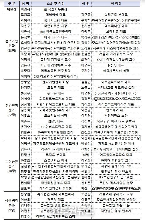 민관 정책협의회는 기업인, 민간 전문가, 학계, VC, 협·단체 등 총 72명의 위원으로 구성되어 출범일로부터 1년간 활동하게 된다. 또한 한성숙 중기부 장관과 이광재 전 국회사무총장이 공동위원장을 맡아 민관 정책협의회를 이끌어갈 예정이다.