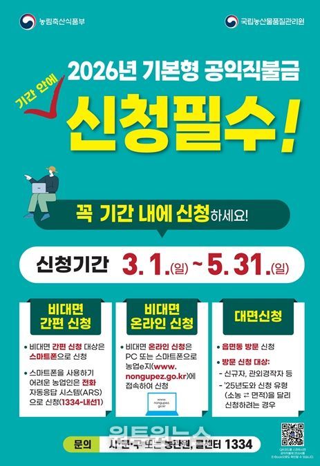 (원투원뉴스) 강원특별자치도는 2026년 기본형 공익직불금 신청을 3월 1일부터 5월 31일까지 3개월간 접수한다고 밝혔다.