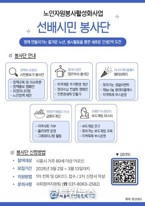 봉사단 인원은 총 10명을 선정할 계획으로, 모집 기간은 3월 13일까지다. 신청은 시흥시노인종합복지관 사회참여지원팀으로 전화하거나 홍보 포스터의 정보무늬(큐알코드)를 통해 하면 된다.