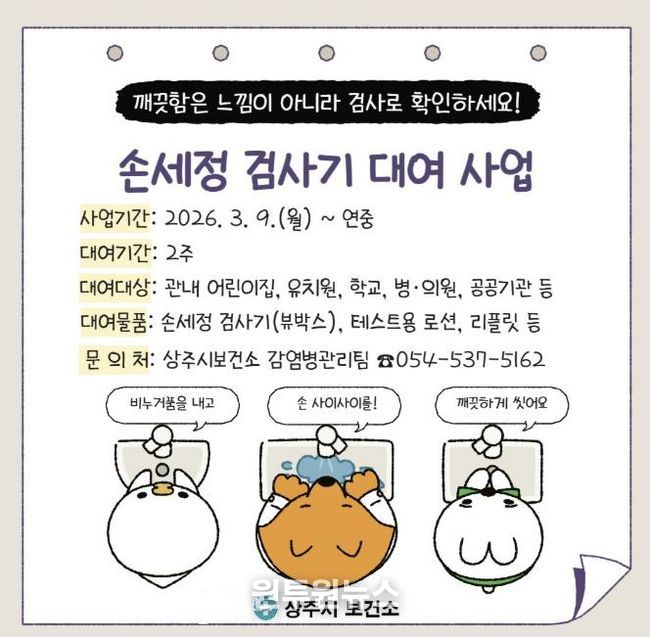 (원투원뉴스) 상주시보건소는 지역 어린이집, 유치원, 학교, 공공기관 등을 대상으로 올바른 손씻기 습관 형성과 감염병 예방을 위한 ‘손세정 검사기 대여 서비스’를 3월부터 연중 운영한다고 밝혔다.