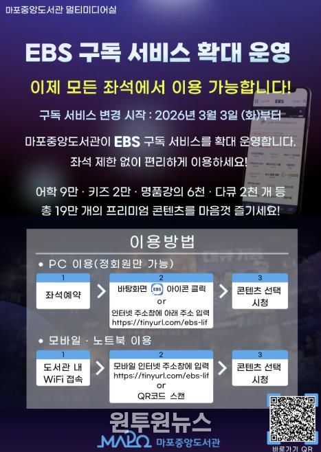 (원투원뉴스) 마포구 구립도서관인 마포중앙도서관은 이용자에게 편리하고 폭넓은 영상자료 서비스를 선보이기 위해 2026년 3월부터 ‘EBS Play+ 구독 서비스’를 확대 운영한다.