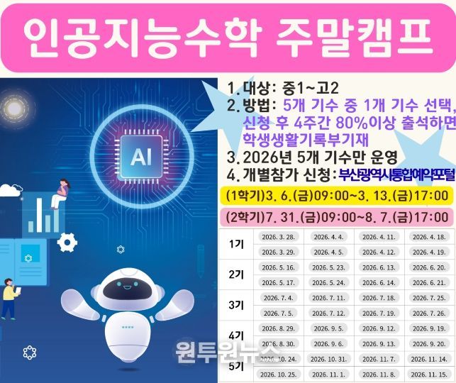 (원투원뉴스) 부산광역시교육청창의융합교육원(원장 한종환) 분원 부산수학문화관은 3월부터 오는 11월까지 부산수학문화관에서 부산 지역 중·고등학생 500명을 대상으로 ‘2026 인공지능 수학 주말캠프’를 운영한다.