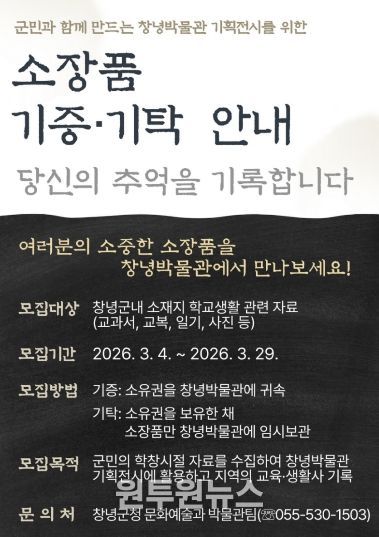 소장품 모집 기간은 3월 4일부터 3월 29일까지이며, 참여를 희망하는 군민은 기증 또는 기탁의 방식으로 창녕박물관에 접수하면 된다.