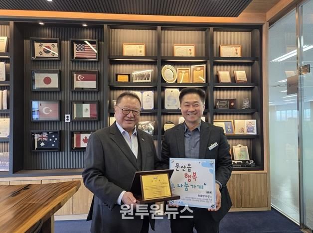 (원투원뉴스) 파주시 문산읍은 5일, 지역사회 나눔문화 확산에 기여해 온 한울생약㈜을 ‘행복나눔가게’16호점으로 선정하고 현판 및 감사패 전달식을 가졌다.