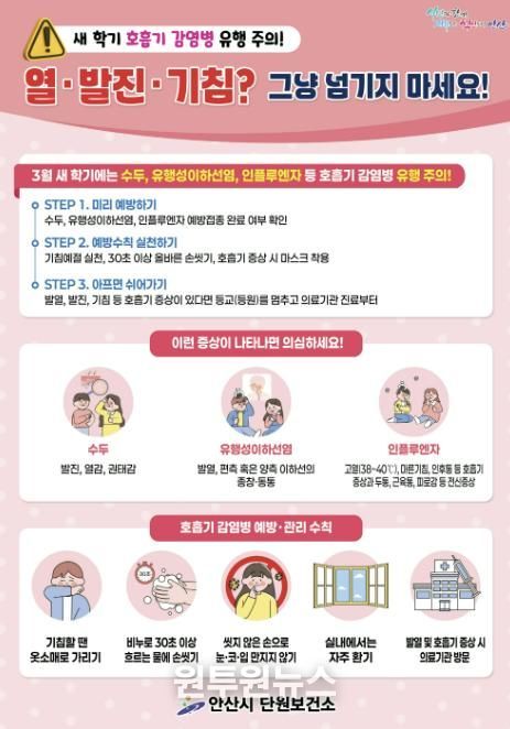 (원투원뉴스) 안산시 단원보건소는 새 학기를 맞아 유치원과 초·중·고등학교를 중심으로 호흡기 감염병 발생 증가가 우려됨에 따라 학생과 교직원의 각별한 주의를 당부했다.
