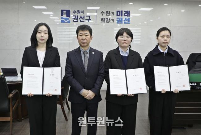 (원투원뉴스) 수원시 권선구는 지난 5일, 권선구청 2층 집무실에서 신규 공직자 3명이 참석한 가운데 임용장 수여식을 개최했다.