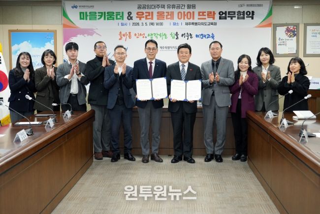 (원투원뉴스) 제주특별자치도교육청은 제주특별자치도개발공사와 5일 도교육청 상황실에서 공공임대주택 유휴공간을 활용한 ‘우리 올레 아이 뜨락’ 사업과 도교육청 ‘2026 마을키움터 운영’ 사업의 상호 협력을 위한 업무협약을 체결했다.