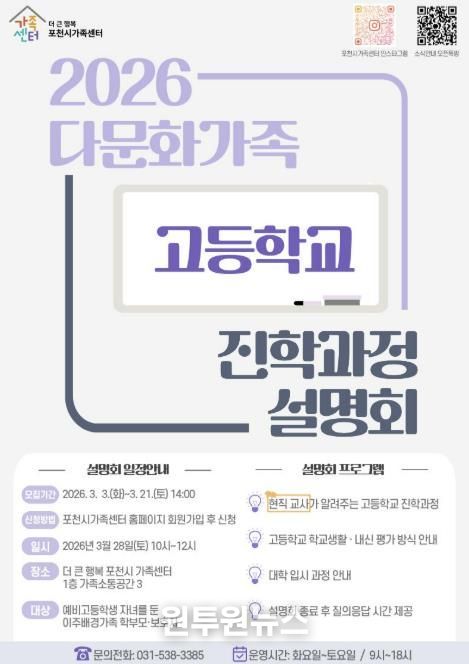 (원투원뉴스) 포천시 직영 더 큰 행복 포천시가족센터가 오는 28일, '2026 다문화가족 고등학교 진학과정 설명회'를 개최한다.