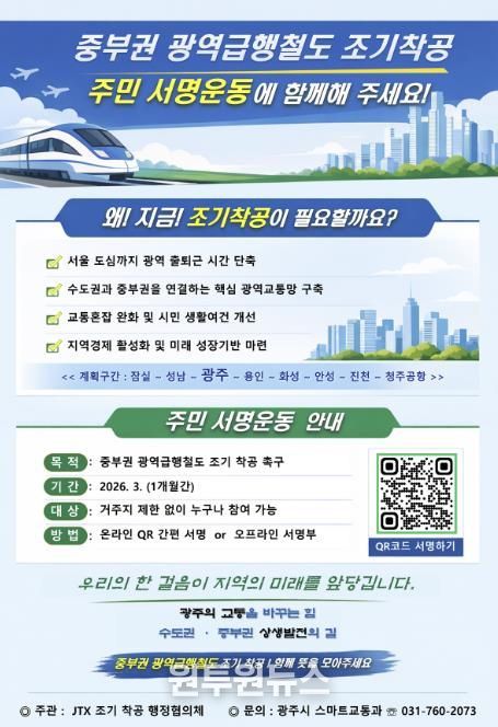 (원투원뉴스) 광주시는 중부권 광역급행철도의 조기 착공을 촉구하기 위해 3월 한 달간 주민 서명운동을 한다고 6일 밝혔다.