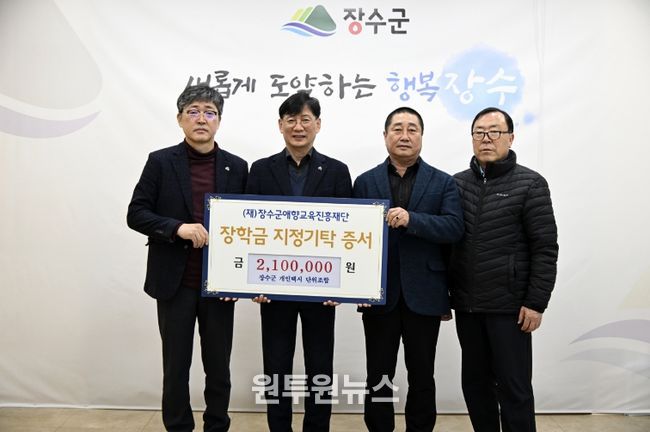 (원투원뉴스) (재)장수군애향교육진흥재단(이사장 최훈식)은 장수군개인택시단위조합(조합장 정춘원)이 5일 군청을 찾아 장학금 210만원을 기탁했다고 밝혔다.