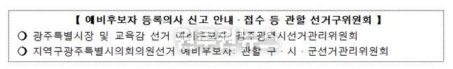 또한, 「공직선거법」 제53조 제1항에 따른 공무원 등은 3월 5일까지 사직해야 공직선거에 입후보가 가능하나, 광주특별시 시장 및 교육감 선거에 입후보하려는 공무원 등은 특별법에 따라 3월 15일까지 사직하면 입후보가 가능하다.