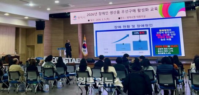 (원투원뉴스) 평택시는 지난 5일 시청 본관 2층 대회의실에서 평택시 공무원을 대상으로 '2026년 장애인생산품 우선구매 활성화 교육’을 실시했다.