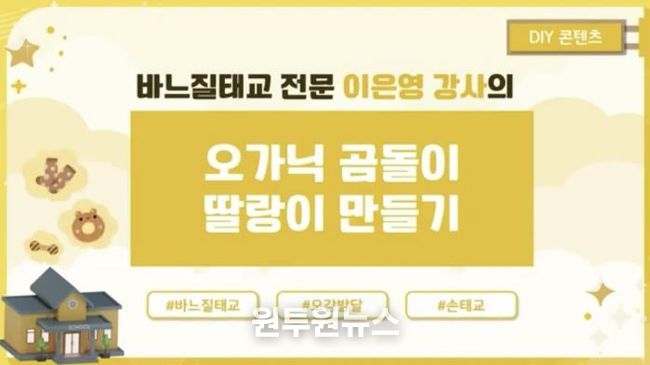 또한 3강은 엄마의 소근육 운동과 함께 아기의 두뇌 발달과 정서적 교감을 돕는 손수 제작(DIY) 손태교 교육으로 진행된다. 양평군보건소는 선착순 40명을 모집해 손수 제작(DIY) 바느질 태교 재료(곰돌이 딸랑이 만들기)를 자택으로 배송할 예정이며, 참여자는 동영상 강의를 보며 2주간 교육을 받을 수 있다.