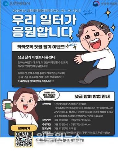 댓글달기 참여는 3월 16일부터 22일까지 인천광역새일센터 인스타그램 및 인천미추홀, 인천서구, 남동새일센터는 카카오톡 오픈채팅방을 통해 가능하며, 자세한 내용은 인천광역새일센터로 문의하면 된다.