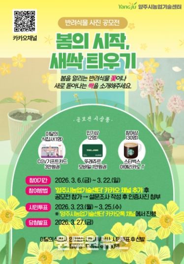 참여 기간은 3월 6일부터 22일까지이며 반려식물에 관심 있는 시민이면 누구나 참여할 수 있다. 참여를 원하는 시민은 ‘양주시농업기술센터’ 카카오톡 채널을 추가한 뒤 공모전 참가 메뉴에서 설문을 작성하고 인증 사진을 제출하면 된다.