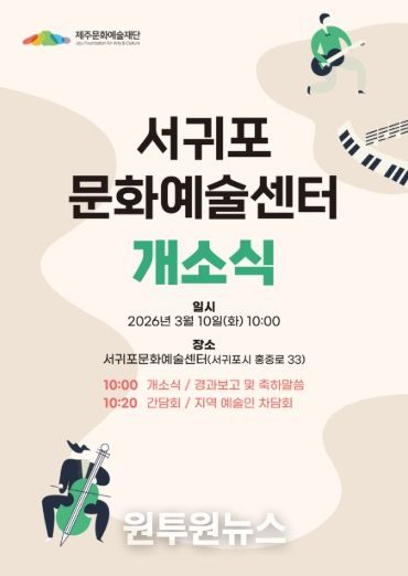 (원투원뉴스) 제주문화예술재단은 오는 3월 10일 오전 10시 서귀포문화예술센터(서귀포시 홍중로 33)에서 개소식을 개최한다. 재단은 이번 개소를 계기로 산남지역 문화예술 지원 기능을 전담하는 거점 체계를 본격 운영할 계획이다.