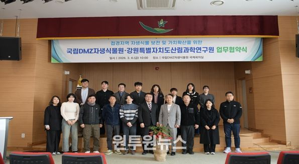 (원투원뉴스) 강원특별자치도 산림과학연구원(원장 채병문)은 3월 6일 국립DMZ자생식물원 국제회의실에서 DMZ 및 접경지역 자생식물의 현지 외 보전과 육성을 위한 협력 강화를 위해 국립DMZ자생식물원(원장 이봉우)과 업무협약을 체결했다.