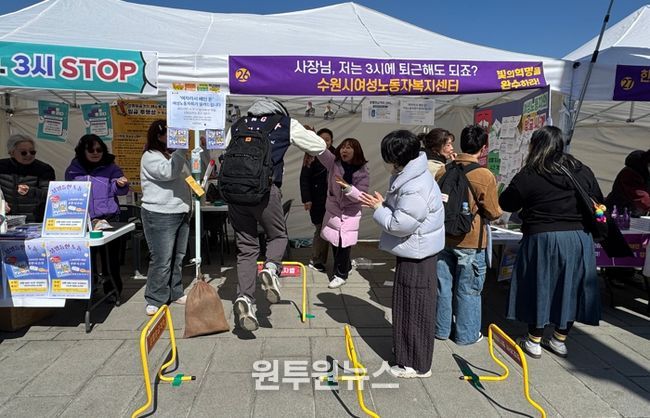 (원투원뉴스) 수원시 여성노동자복지센터는 7일 광화문 서십자각에서 열린 ‘제41회 한국여성대회’ 현장에서 시민을 대상으로 ‘일·생활 균형 인식개선 캠페인’을 펼쳤다.