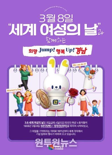 (원투원뉴스) 경상남도는 3월 8일 세계 여성의 날을 맞아 여성의 사회 참여 확대와 양성평등 사회 실현을 위한 다양한 정책을 추진하고 있다고 밝혔다.