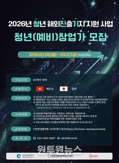 (원투원뉴스) 인천광역시와 인천창조경제혁신센터는 지역 청년 창업가의 해외 시장 진출을 지원하고 글로벌 경쟁력을 갖춘 기업으로 육성하기 위해 '2026년 청년 해외진출기지 지원사업(청진기 사업)'을 본격 추진하며, 3월 9일부터 27일까지 참여할 청년 (예비)창업가 25명을 모집한다고 밝혔다.