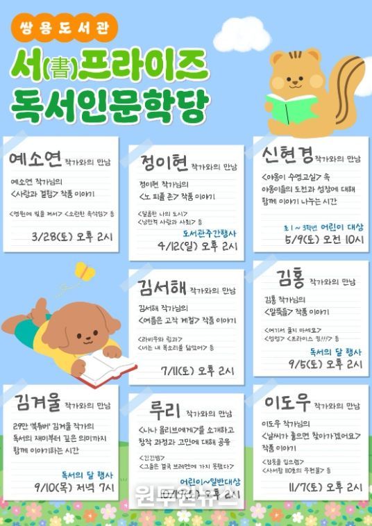 쌍용도서관 관계자는 “이번 프로그램을 통해 시민들에게 작가와 책의 이야기를 가까이에서 만나는 선물같은 시간이 되길 기대한다”고 말했다.
