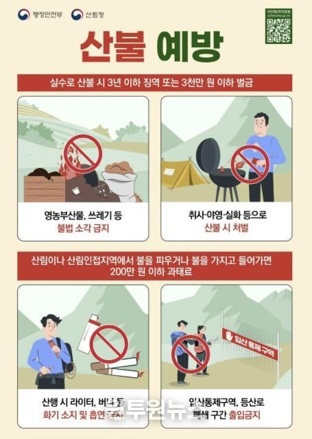 최근 건조한 날씨와 강풍 등으로 산불 위험이 높아짐에 따라 논·밭두렁 및 영농 부산물, 쓰레기 등을 태우는 행위가 대형 산불로 이어질 가능성이 커 각별한 주의가 요구된다.