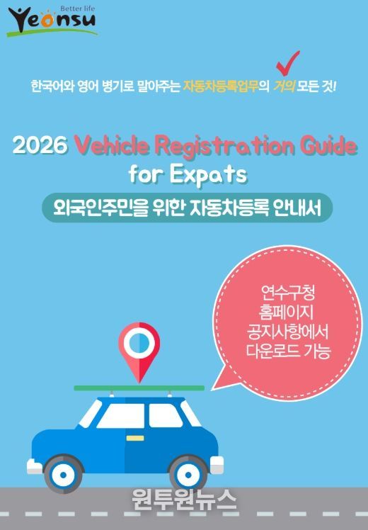 (원투원뉴스) 연수구는 지난달 27일부터 인천광역시 자치구 최초로 ‘외국인 주민을 위한 자동차등록 안내서(‘2026 Vehicle Registration Guide for Expats)’를 제작하고, 구청 누리집을 통해 PDF 파일로 무료 배포하고 있다.