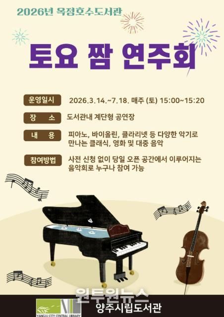 (원투원뉴스) 양주시 옥정호수도서관이 오는 3월 14일부터 7월 18일까지 시민들이 일상 속에서 음악을 즐길 수 있도록 ‘토요 짬 연주회’를 진행한다.