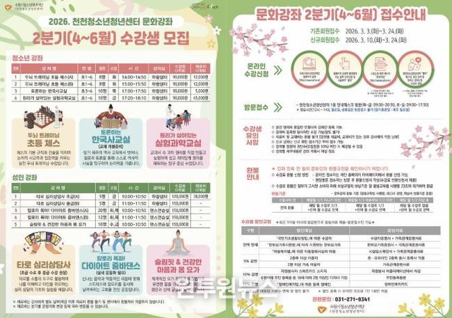 (원투원뉴스) 수원시청소년청년재단 천천청소년청년센터는 오는 3월 10일부터 지역주민과 청소년의 활기찬 일상을 지원하기 위한 2026년 2분기 문화강좌 신규 수강생을 모집한다고 밝혔다.