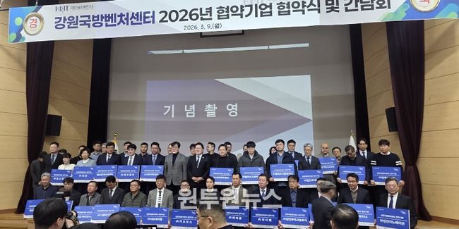 (원투원뉴스) 강원특별자치도는 3월 9일 오후 2시 강원대학교 60주년기념관에서 김광래 도 경제부지사 주재로 도내 중소·벤처기업의 방산 진출을 지원하기 위한 '2026년 강원국방벤처센터 협약식'을 개최했다.