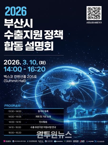 (원투원뉴스) 부산시는 오늘(10일) 오후 2시 벡스코(BEXCO) 컨벤션홀 205호에서 '2026 부산 수출지원정책 합동설명회'를 개최한다고 밝혔다.