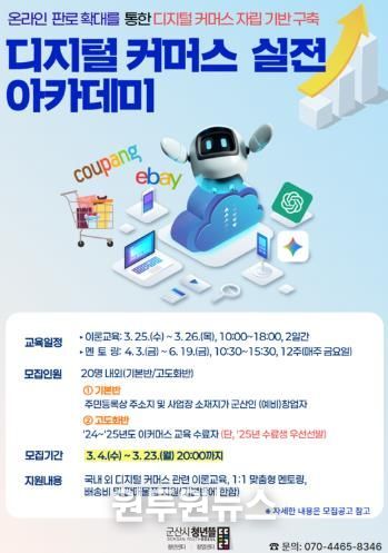 (원투원뉴스) 군산시 청년뜰 창업센터에서 군산 지역 (예비)창업가의 국내⸱외 디지털 커머스 시장 진입과 초기 매출 창출을 지원하기 위해 3월 23일까지‘디지털 커머스 실전 아카데미’ 참여자를 모집한다.