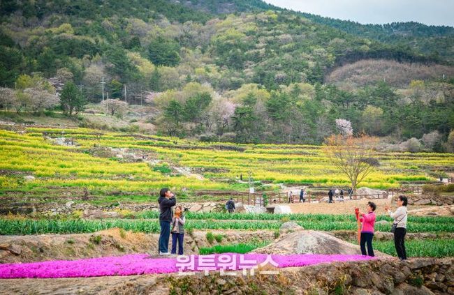층층이 쌓인 계단식 논에 유채꽃이 흐드러지게 피어, 남해 특유의 지형과 바다가 만들어낸 이색적인 봄 풍경을 배경으로 '인생 사진'을 남기려는 관광객들의 발길이 이어지고 있다.