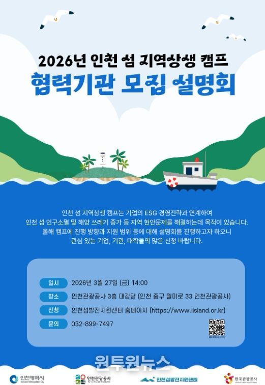 (원투원뉴스) 인천광역시와 인천관광공사는 기업·기관·대학의 ESG 실천과 인천 섬 지역 상생을 연계하기 위한'2026 인천 섬 지역상생 캠프'협력기관 모집 설명회를 3월 27일 오후 2시 상상플랫폼 3층에서 개최한다고 밝혔다.