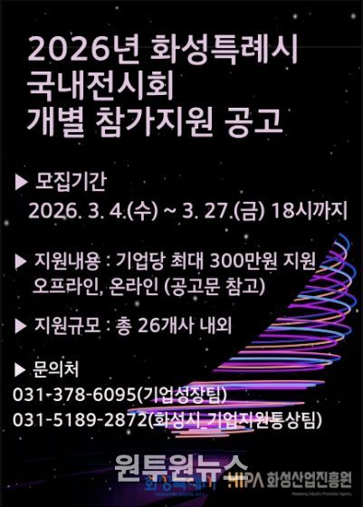 (원투원뉴스) 화성산업진흥원은 관내 중소기업의 국내 판로 확대와 브랜드 인지도 제고를 위해 ‘2026년 화성시 국내 전시회 개별참가 지원사업’을 추진하고, 참여기업 26개사를 모집한다고 밝혔다.