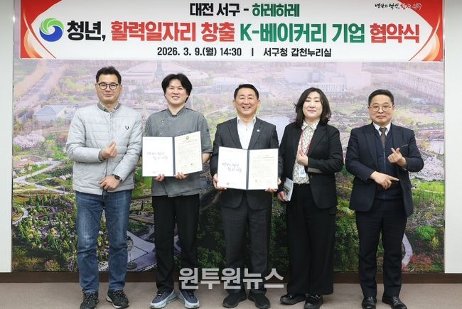 (원투원뉴스) 대전 서구는 청년활력일자리창출 11번째 협약 기업으로 지역 대표 K-베이커리 하레하레(대표 이창민)를 선정하고 ‘2026년 청년 활력 일자리 창출’을 위한 업무협약을 체결했다고 10일 밝혔다.